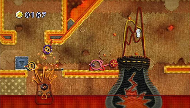 I don't think screenshots really do the game its full justice. It's when you see Epic Yarn's amazingly realized world of felt, yarn, pipe cleaners, and cloth patches moving and interacting with one another and Kirby that the magic really happens. Seriously, just TRY to keep your teeth from rotting right out of your fool head as you see Kirby transform into cute little yarn cars, helicopters, and tanks, or try to suppress all the "D'awwwwww" you have inside of you when he goes rooting around under the backgrounds and all you see it a cute little lump moving around realistically under the fabric. It's adorable.