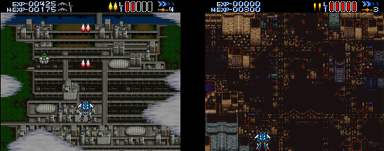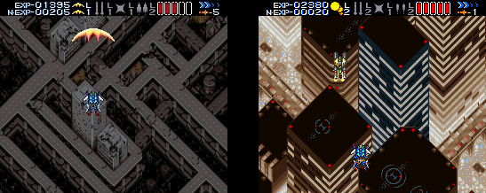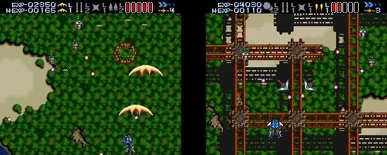 First off, the graphics. The first thing everyone notices is the games unique approach to overhead stages. Instead of a straight down view above the ship, the "camera" is pointed a bit up, allowing you to see forward towards the horizon. Enemies and scenery appear far away and grow in size as they get closer to you. The effect is quite impressive for a 16 bit system. The game isn't all overhead though, half the stages are side view, and these are quite impressive as well, particularly the lush underwater caves of stage 4. Most impressive is how despite all this, the game has almost no slowdown whatsoever.