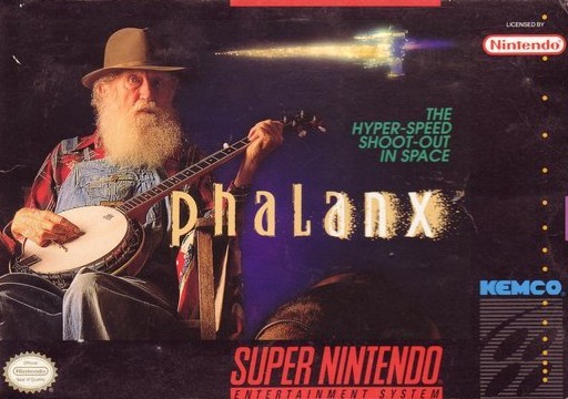 So there it is, the amazing American box art. A guy and his banjo. Oh and some sort of sparkle in the background that's supposed to be a spaceship. It's a bad box for sure, as for the most part it confuses people, given that banjo guy has absolutely nothing to do with the game. But after playing the game, I can see why they would try to do something to grab a little attention. Phalanx is a game that is just sort of.. there. It's easiest to describe as forgettable, and incredibly generic. So I can see why a marketing department would try something to at least get people to go "What the hell is that?" and pick the box up, because otherwise the game would be lost in the seas of similar shoot em ups.